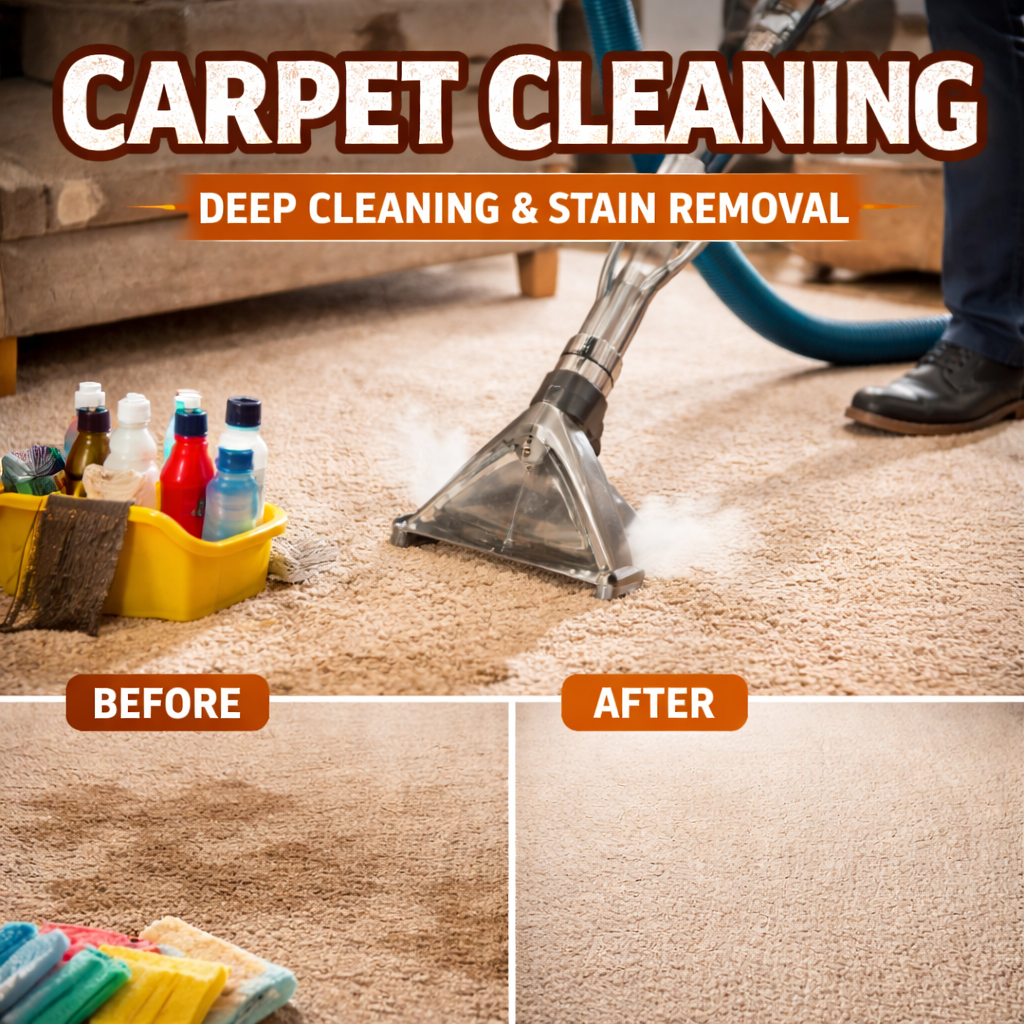 Transform your home or office with our top-tier carpet cleaning services! Our skilled technicians use advanced techniques to meticulously remove stubborn stains, allergens, and odors, restoring your carpets to their original vibrancy and softness. Experience the difference as we breathe new life into every fiber, ensuring a cleaner, healthier environment for you, your family, or your employees.